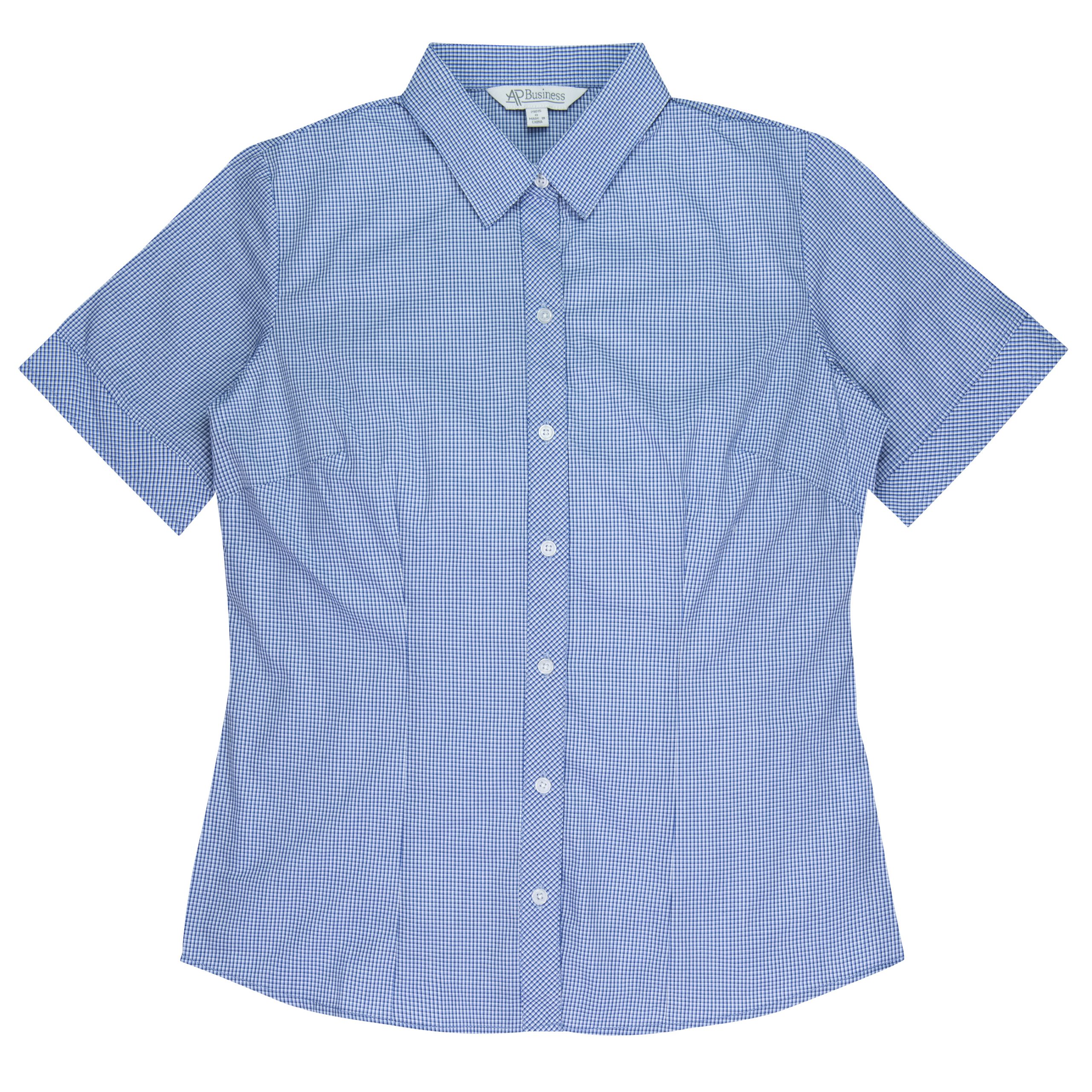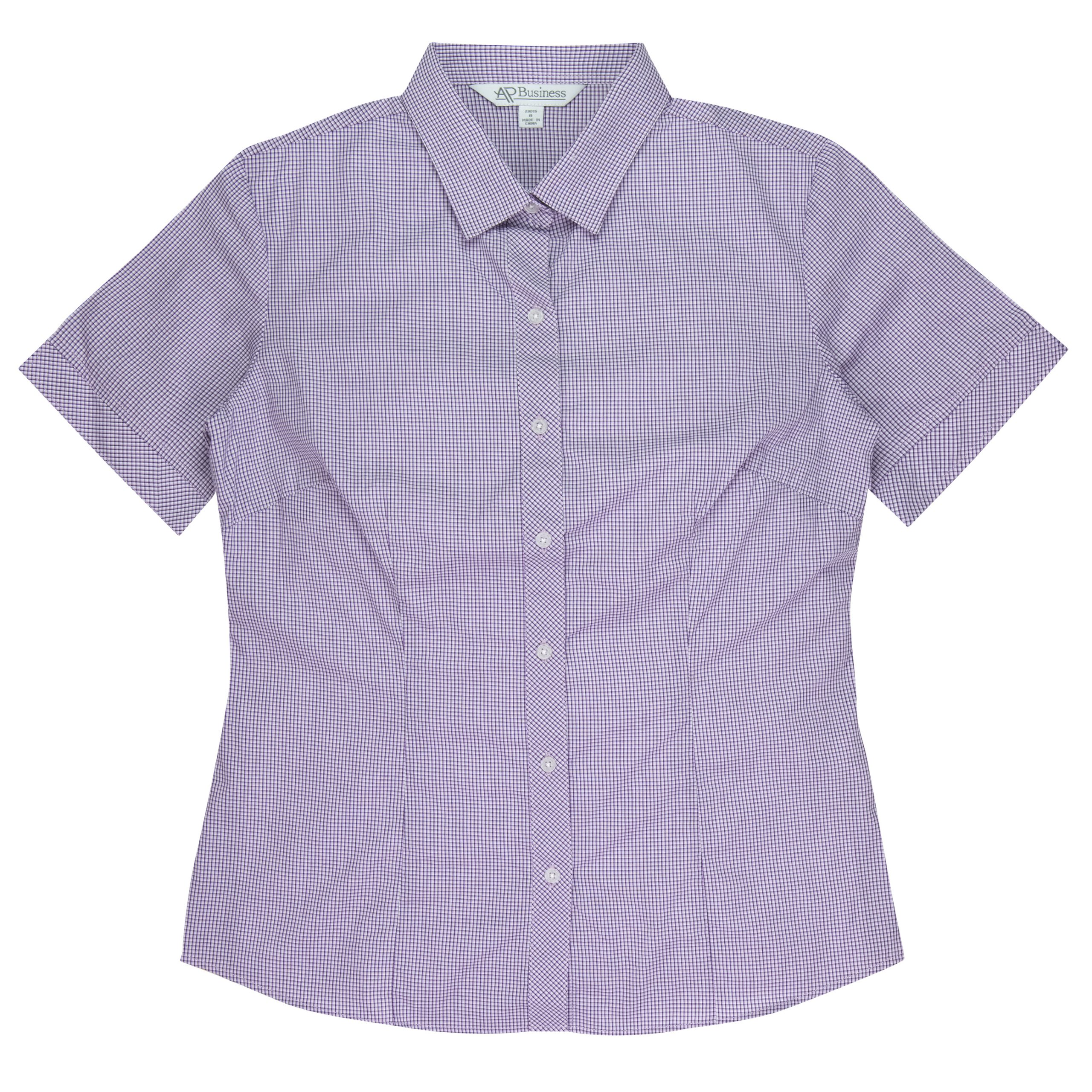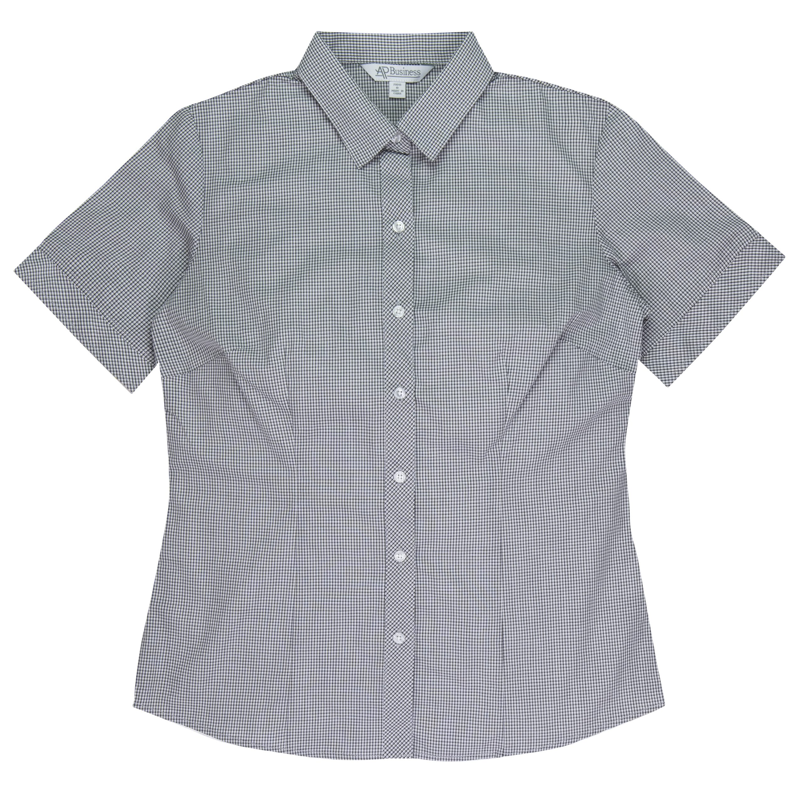 This smart mini-check has a bias cut pleated placket with a hidden Magic Button